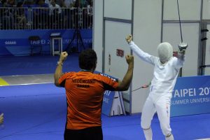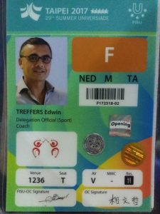 Van 16 augustus tot 28 augustus was onze maître Edwin Treffers als coach aanwezig bij de 29ste zomerspelen in Taipei (Taiwan). Dit evenement is beter bekend onder de naam Universiade. Op dit evenement waren vele sporten vertegenwoordigd (o.a. atletiek, basketbal, schermen, voetbal, ritmische gymnastiek, turnen, judo, zwemmen, openwater zwemmen, tafel tennis, taekwondo, tennis, volleybal, waterpolo, boogschieten, badminton, honkbal, golf, gewichtheffen en wushu). De Universiade is vergelijkbaar met de Olympische Spelen, echter enkel toegankelijk voor studerende (universiteit, hogeschool) atleten tot en met 25 jaar. Er waren zo’n 13.000 atleten en coaches aanwezig, die allen verbleven in een atletendorp dat hermetisch van de buitenwereld was afgesloten middels hekken en beveiliging. De sportlocaties bevonden zich op diverse plekken in Taipei, sommigen in het centrum, sommigen in de buitenwijken. Veelal was vervoer in grote getale, zoals naar de opening van de spelen in het atletiek stadion of het vervoer van of naar de luchthaven, enkel mogelijk met politiebegeleiding.