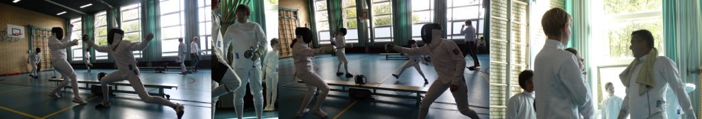 Hierna geeft de maître individuele lessen, waarbij hij opdrachten meegeeft waarmee de schermer zich verder kan ontwikkelen. De overige scherm(st)ers schermen dan onderling partijtjes waarbij het geleerde in de praktijk gebracht wordt. Ook is er aandacht voor jureren. Hierdoor leren de beginners het toepassen van de spelregels. Het lesuur van de junioren en senioren wordt onderbroken door een (korte) pauze. De junior- en seniorleden zijn na de pauze in de gelegenheid om een schermpartner uit te nodigen voor een oefenpartij. Tijdens deze oefenpartijen wordt de aangeleerde techniek in de praktijk gebracht. Tijdens de oefenpartijen wordt er door de maître aan een aantal leden op individuele basis les gegeven.