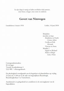 De uitvaart zal plaatsvinden op vrijdag 22 juni om 11.00 uur, begraafplaats Rosenburgh, Rosenburgherlaan 5 Voorschoten.